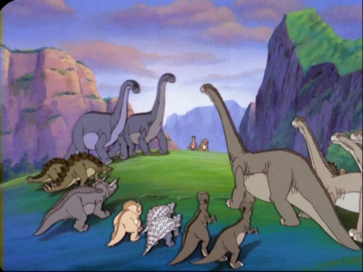Of all the sequels this has the best opening. It uses the same music from the original film. It talks a lot about evolution and how single celled organism became land dwellers, yet I it is actually because of these openings I became a Young Earth creationist. I got exposed to so much evolution I turned against it. I still like seeing the animations of it. They even got the narrator to say “dinosaurs.” I also like how it briefly shows feathered raptors and then they take out a three horned like dinosaur. Like 2 it role calls the entire group. Littlefoot the longneck.