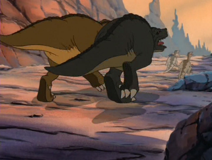 Cera the Threehorn (who has one horn for now). Ducky the swimmer (who is hardly ever shown swimming), Petrie the Flyer (Still love him), and Spike the Spiketail (a little redundant). They are using a huge rock as a ball until Hyp and… Nod and Mutt. Unlike Rinkus and Sierra they blend together. I know the bullies are often hated by older viewers, but these three are great, as they actually come off as murderous. Just considering how soon this is from the original it makes sense. The group is yet to save anyone living in the Valley so no one owes them anything. The bullies are teenagers who probably dislike that some children have had a far more adventurous life than them. In their opening talk Littlefoot views them as potential playmates. Petrie views them as bullies and dislikes them. Ducky and Spike agree with Littlefoot Cera not only agrees with Petrie but tries to fight them, which makes Hyp excited until a meteor shower comes including a big one into The Mysterious Beyond.