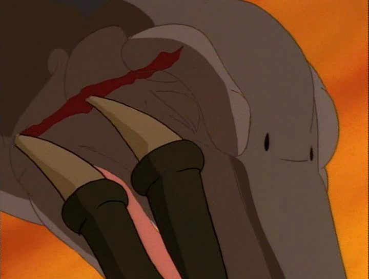 For the first time until nine films later two sharpteeth enter The Great Valley. Ozzy and Strut climb their way back up (arm day today and leg day was yesterday I guess) they go for another nest, but the children’s screaming alerts mommy to save them. Ozzy is clearly mad while strut is slightly funny scared at the same time. Ozzy vows to kill them in retaliation. The gang saw Chomper at an active volcano. Time to completely ignore the poisonous gases. I am really wondering how the volcano did not affect the valley more than the drought next film. The egg stealers find the main characters and threaten to throw them I some boiling water. Strut laughs happily. I have mostly left out that Strut is slowly becoming more murderous like Ozzy. It is not really important to the main plot, but it does help keep the character interesting and show the audience what bad company gives. It started when he was mad the children took their egg. Cera claims they are friends with a huge sharptooth, but she slips and mocks them for being scared by a baby sharptooth.